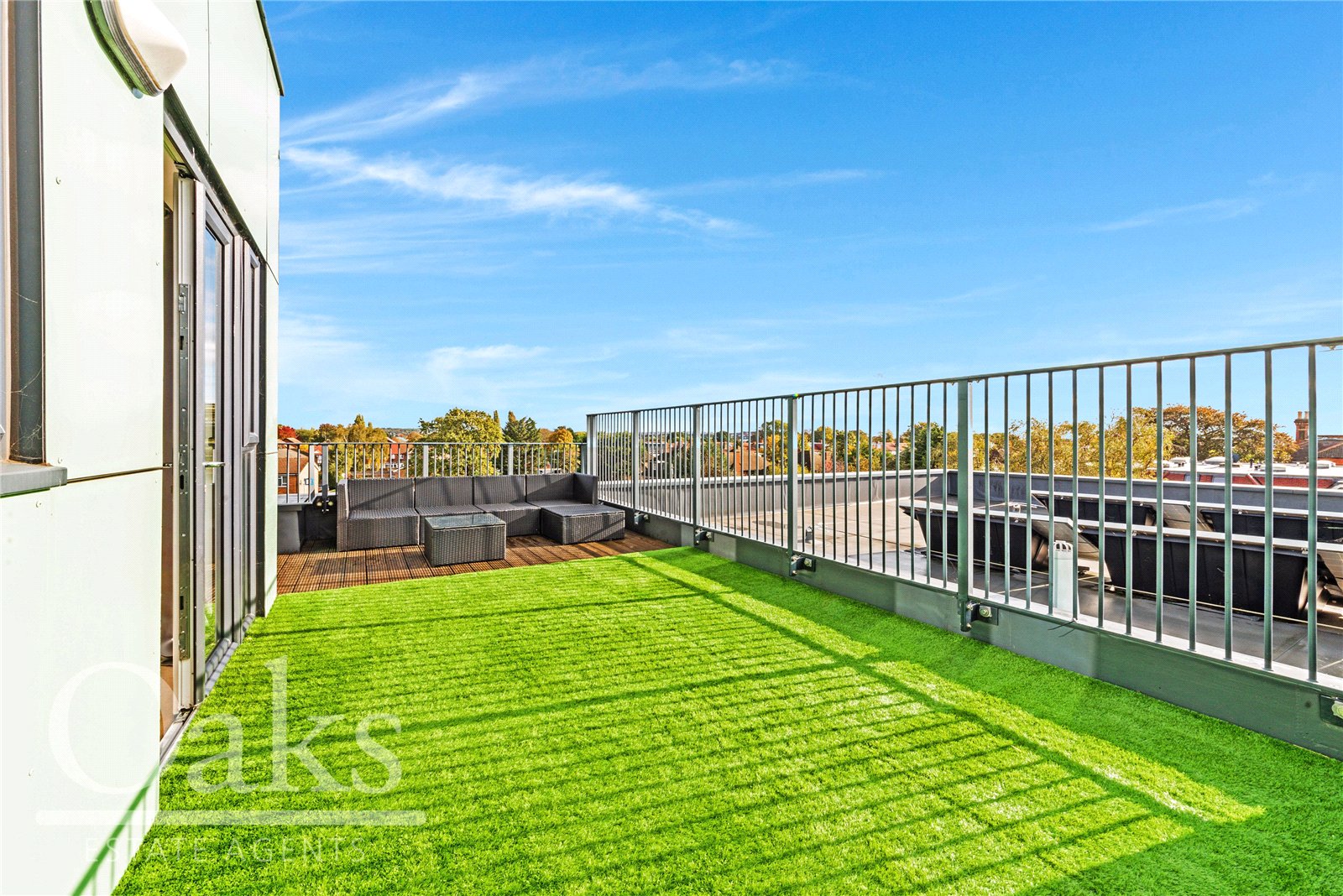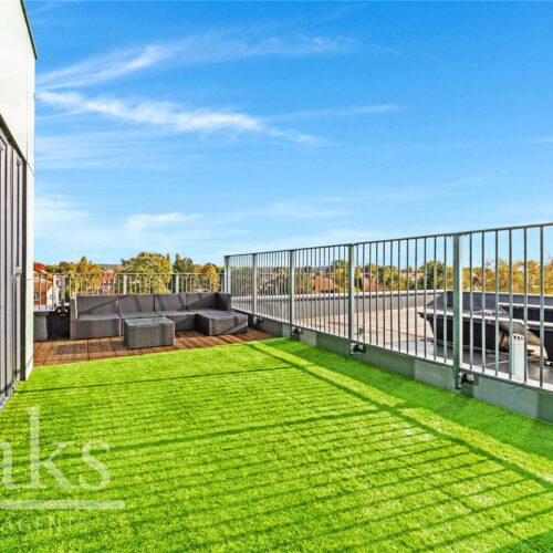 One of the property’s standout features is the stunning private roof terrace with astro-turfed grass, providing a superb outdoor space for relaxing or entertaining while taking in the panoramic city views. Further benefits include a private parking bay, secure bike storage, Nest heating system, and Hyperoptic broadband connectivity.
