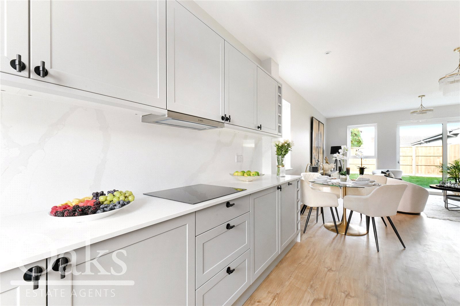 The kitchen is finished to a premium specification with an award winning Shaker-style, handleless design, Bosch integrated appliances, built-in oven with hob and hood, integrated fridge freezer and dishwasher, washer dryer, and durable quartz worktops with matching splashback.