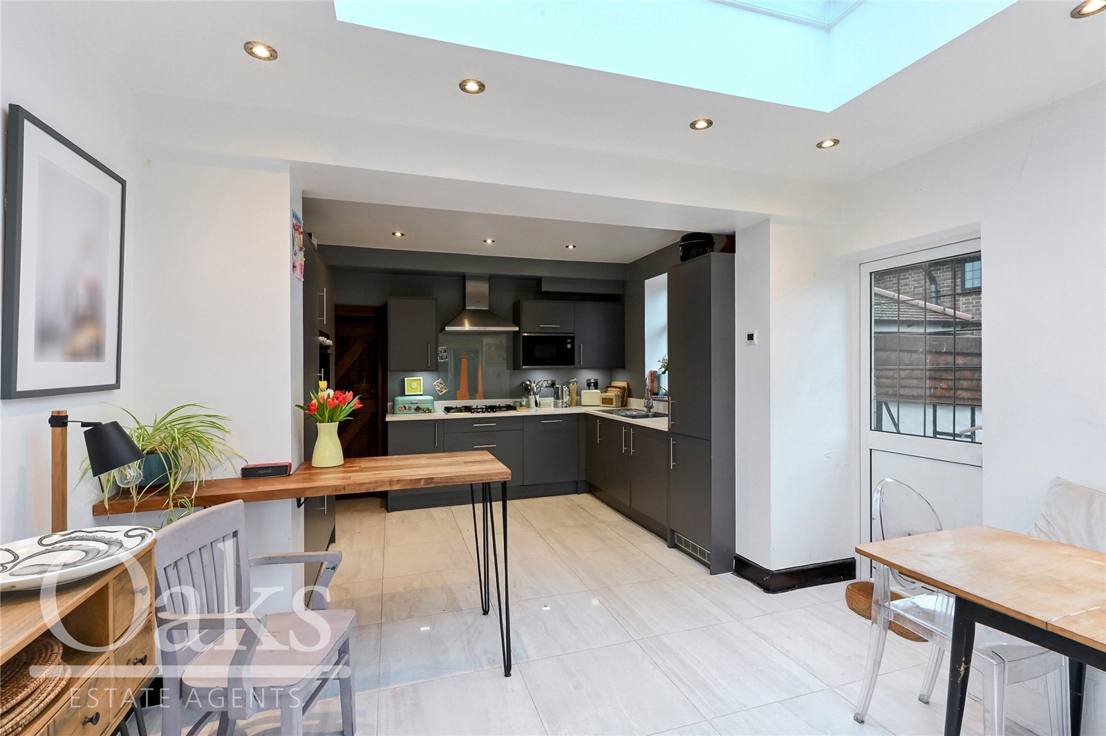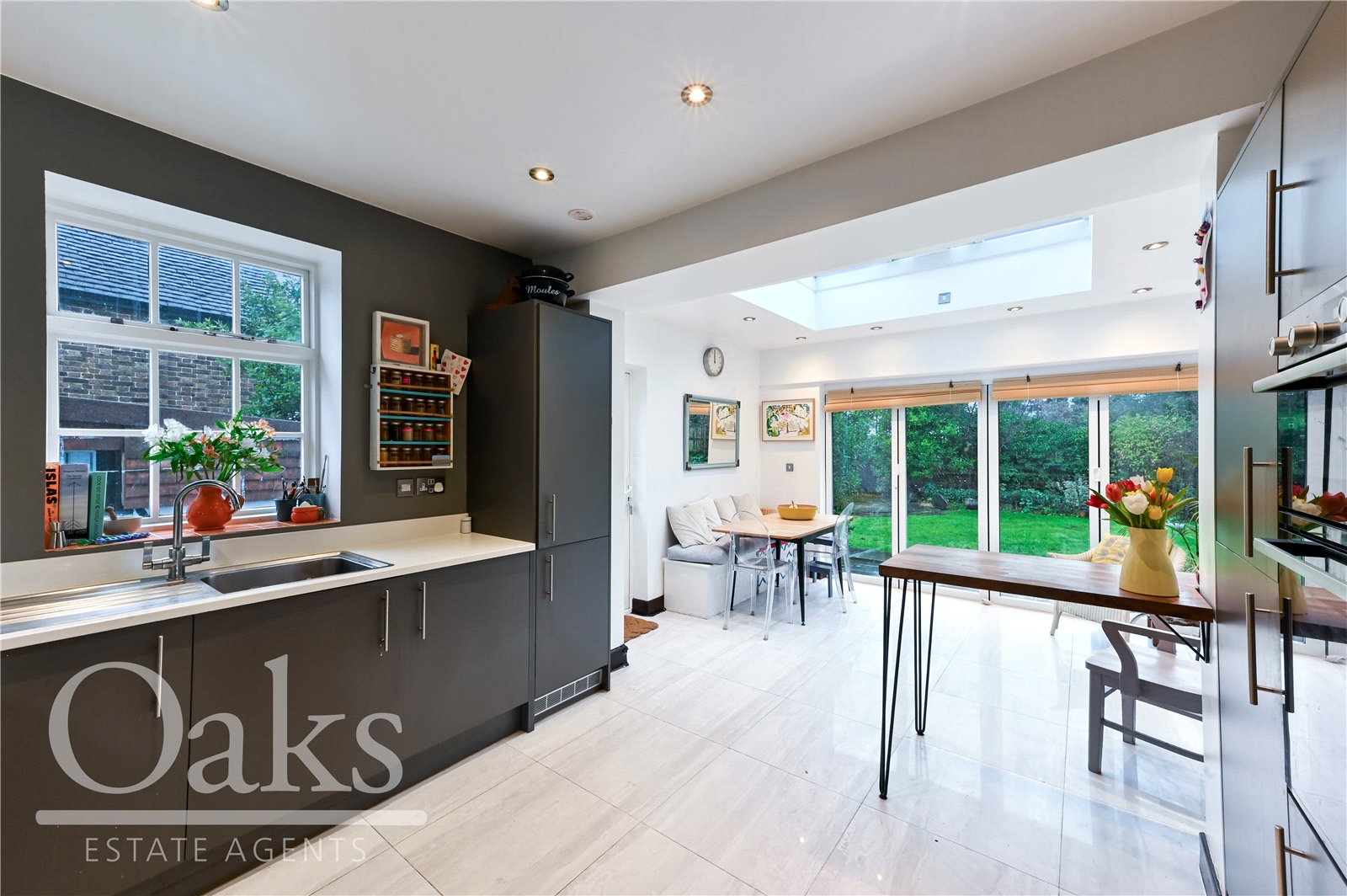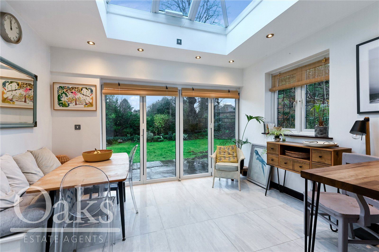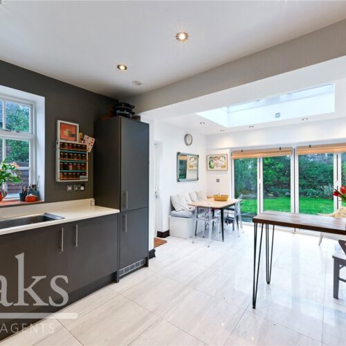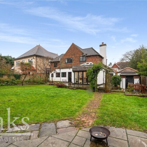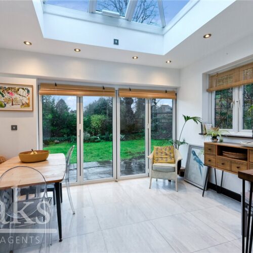 The rear garden connects seamlessly with the kitchen and dining area, creating a fantastic indoor outdoor living space. It offers a perfect balance of a patio area for relaxing and entertaining, alongside a generous lawn ideal for children to play. Additional benefits include a charming summer house and a substantial garage, providing excellent storage or potential for conversion into a home office or studio, subject to requirements.