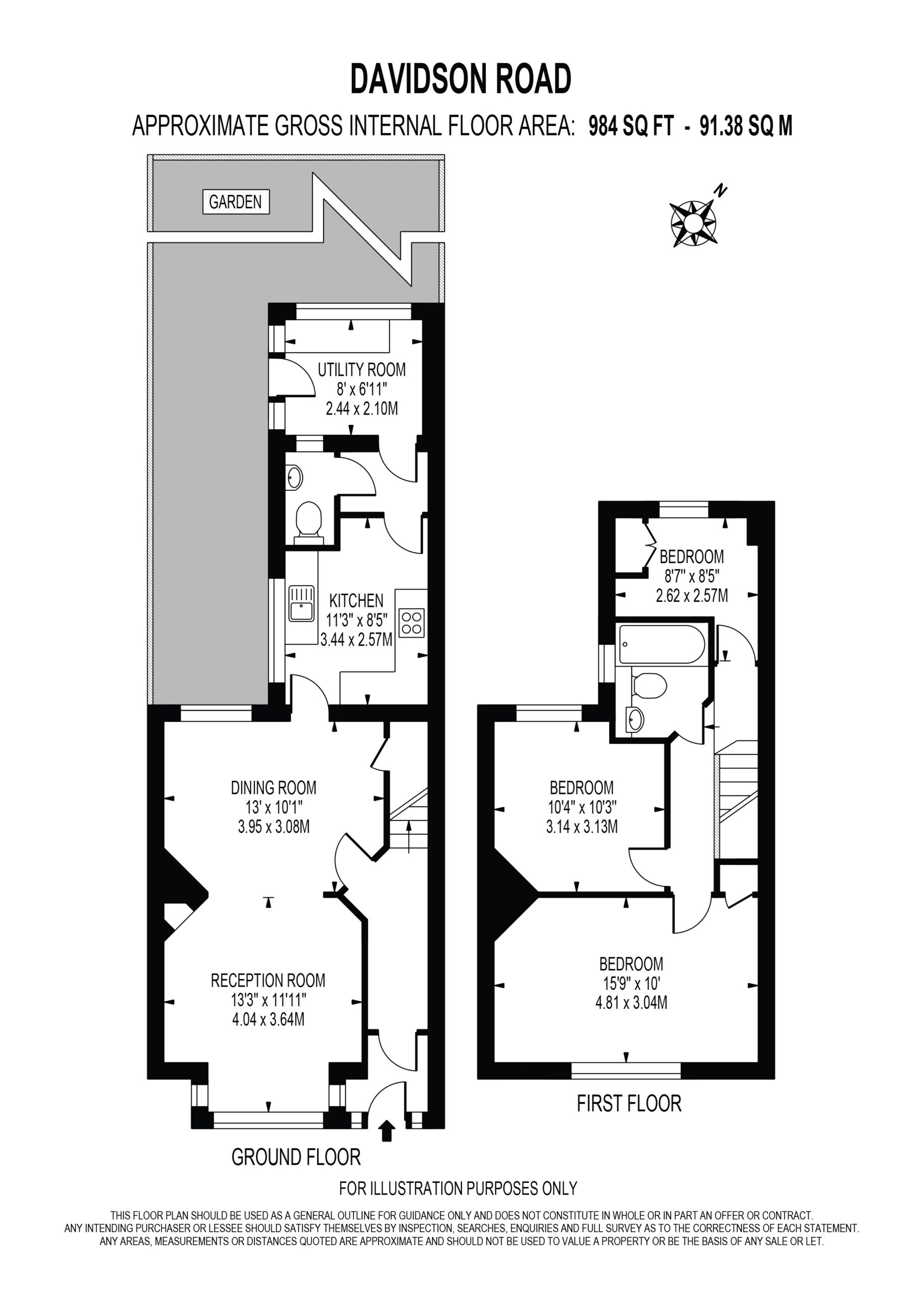 Davidson Road benefits from a generous 984 sq. ft. of living space and briefly comprises; two double bedrooms, one single bedroom, double open plan reception room, separate galley kitchen, bathroom with a separate downstairs w/c and a garden.