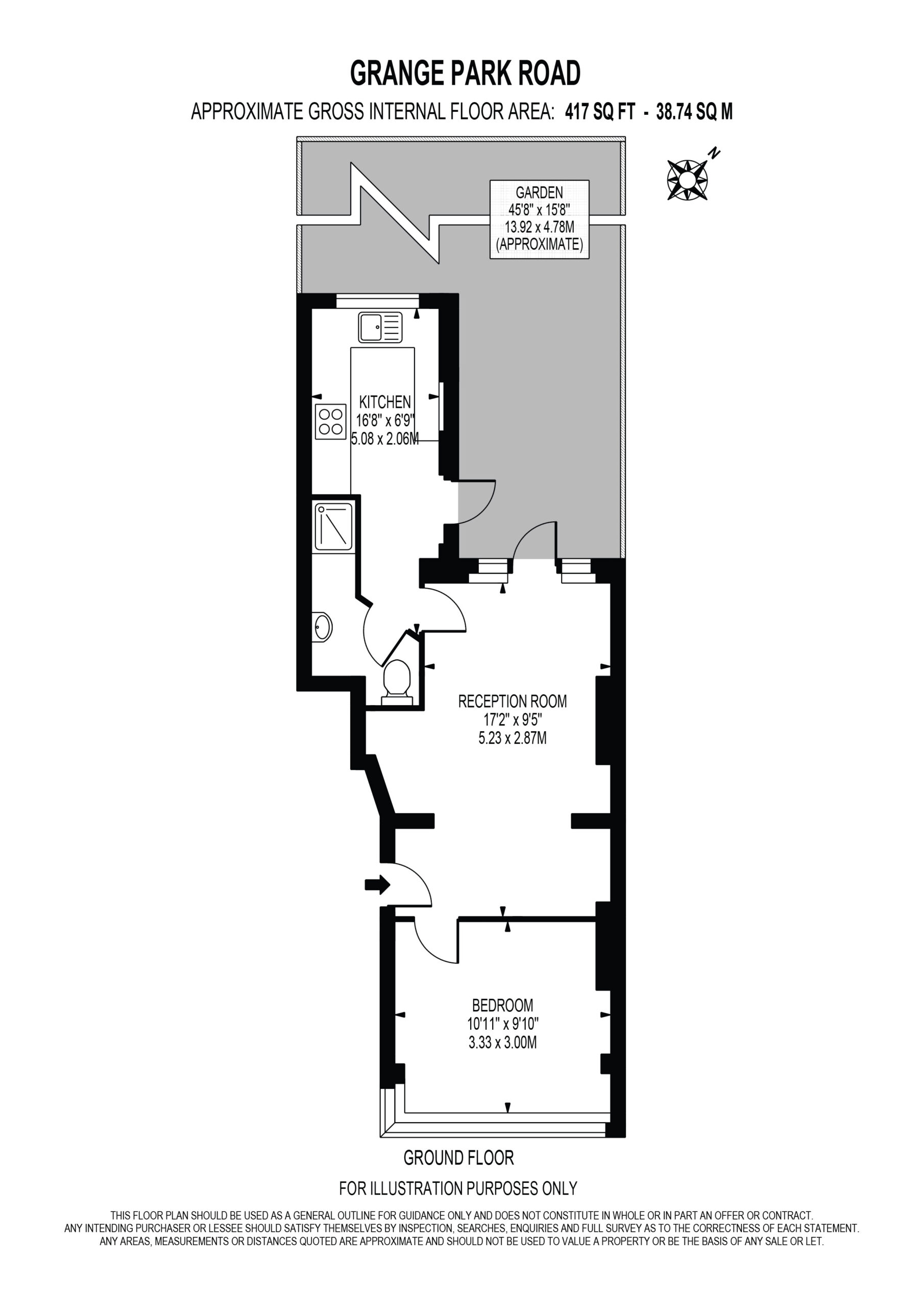 Light and airy throughout, Grange Park Road comprises; 417 sq. ft. of living space and briefly comprises; one double bedroom, spacious reception room, bathroom suite, kitchen and direct access to a private garden.