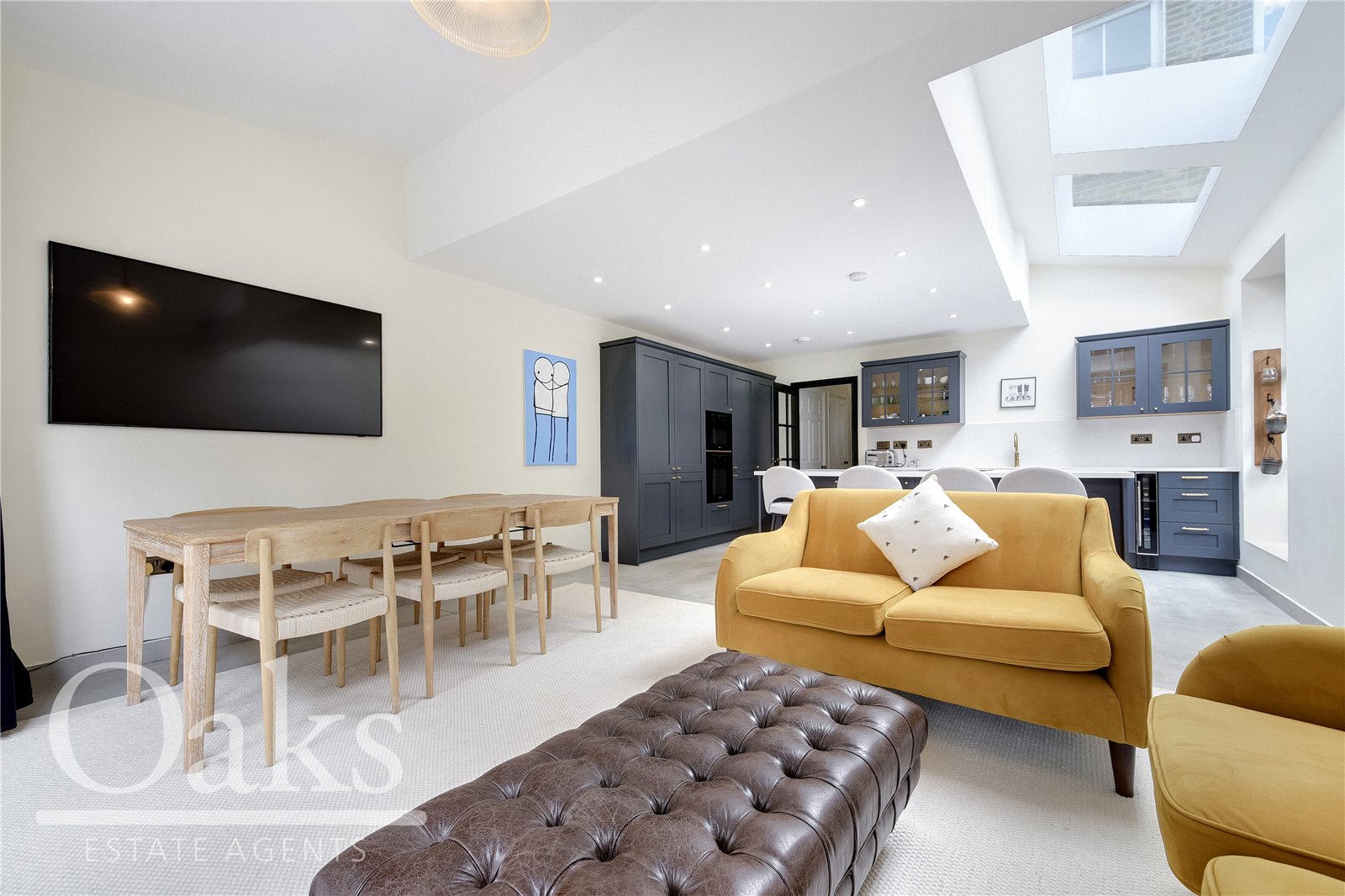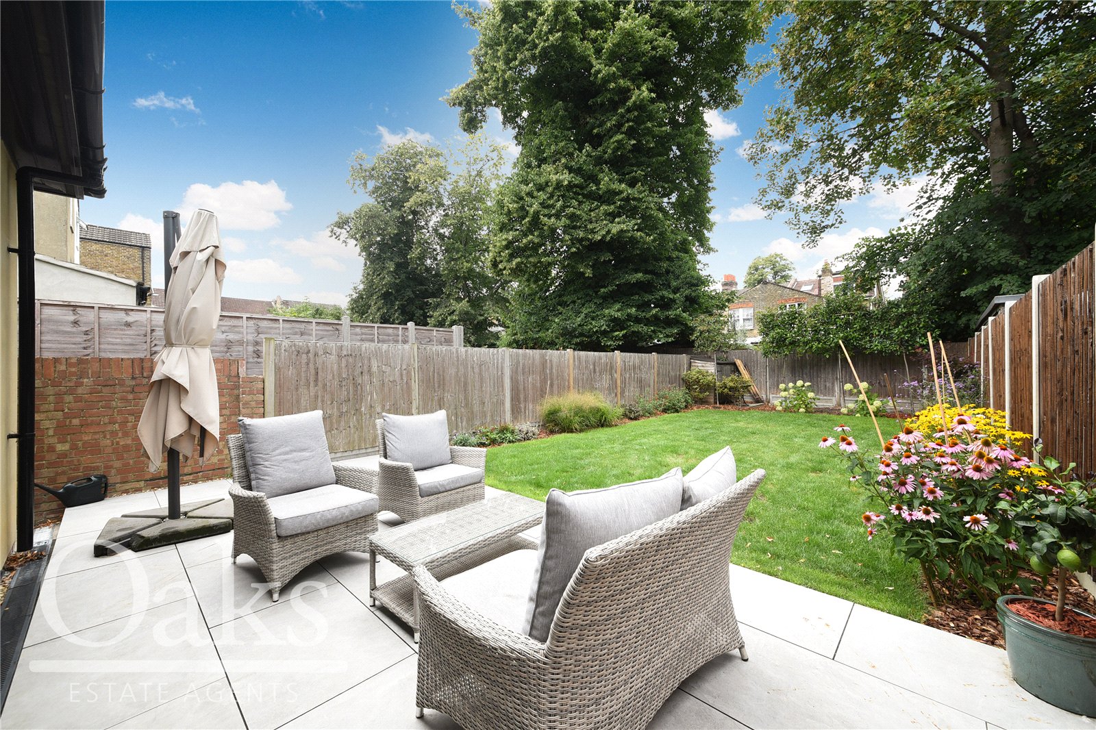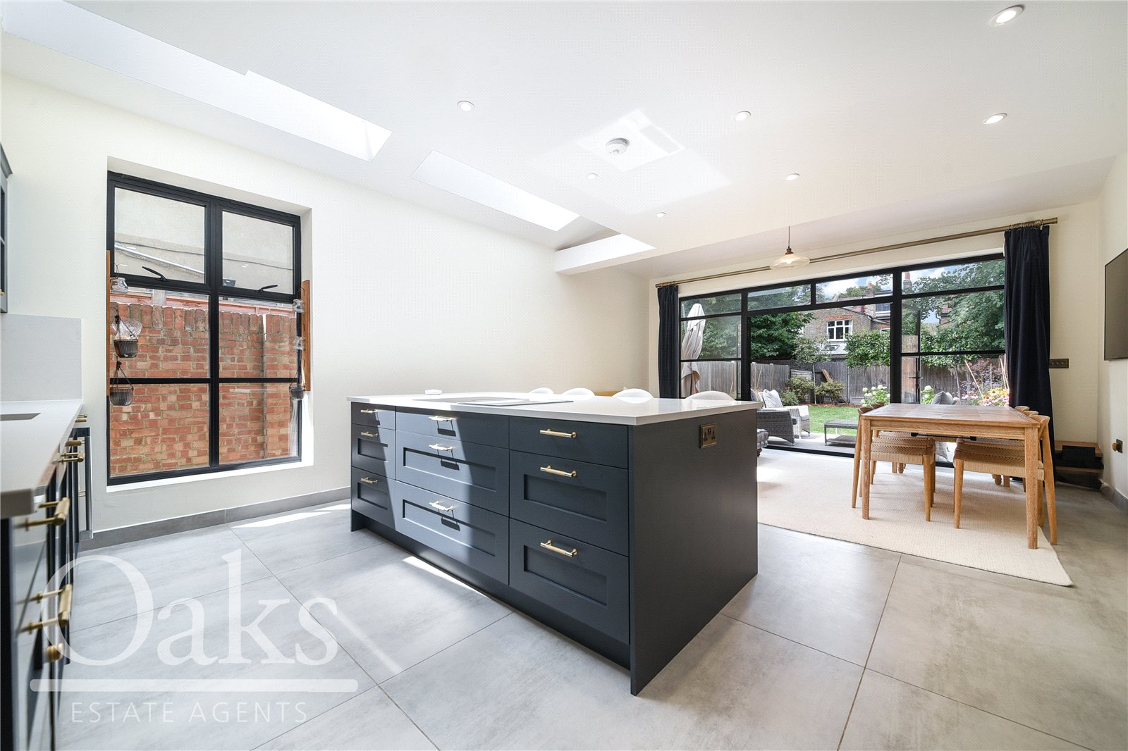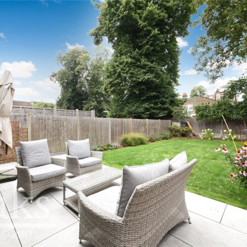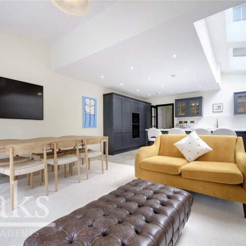 The ground floor boasts a stunning through-lounge, seamlessly connecting the original front reception to the rear dining area, perfect for both relaxing and entertaining. A high-end rear extension houses a striking open-plan kitchen and dining area, finished with integrated appliances and designed to a premium standard. Large doors lead out to a well-tended private garden, with a charming patio ideal for outdoor dining and a lush lawn offering space for play or leisure.