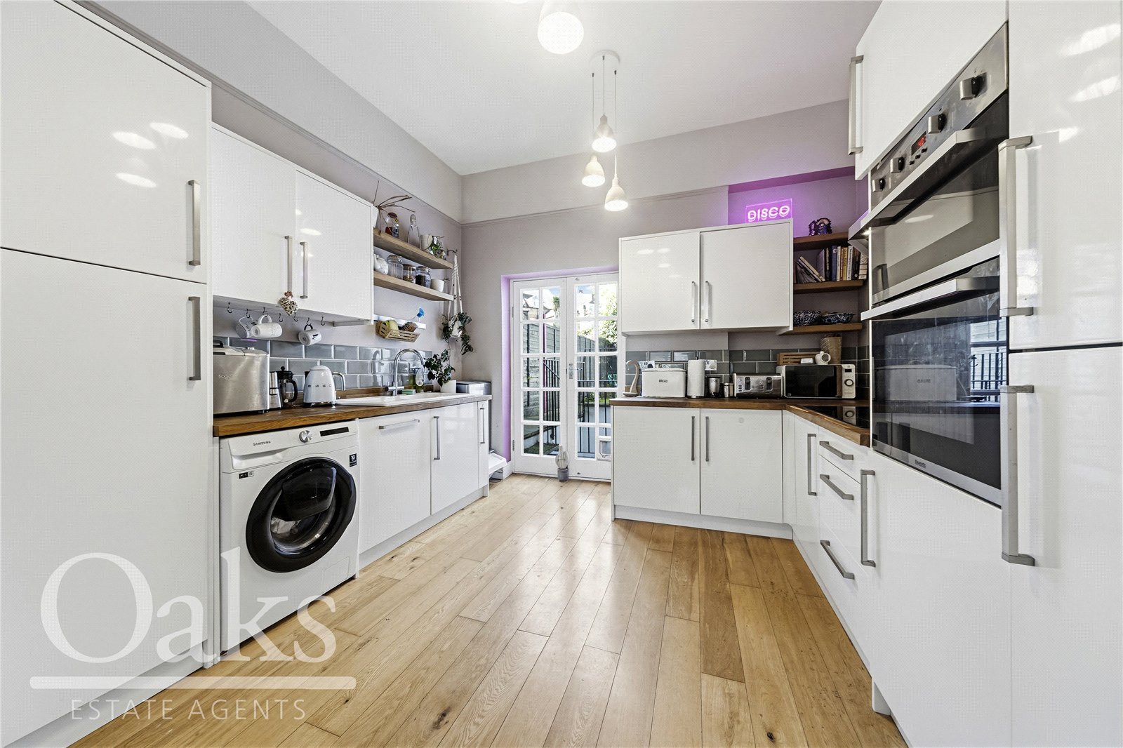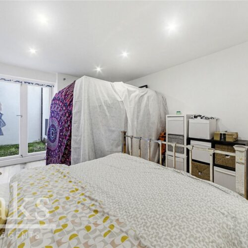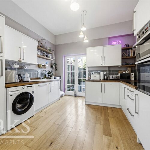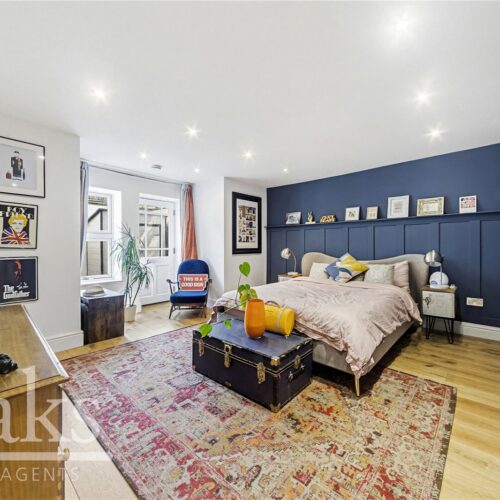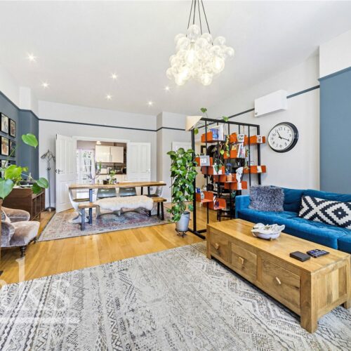 The property features a bright and spacious reception room with high ceilings and plenty of natural light, creating an inviting space for relaxing or entertaining. The contemporary kitchen is well-appointed, offering ample worktop and storage space and easy access to one of the flat’s private patio areas.